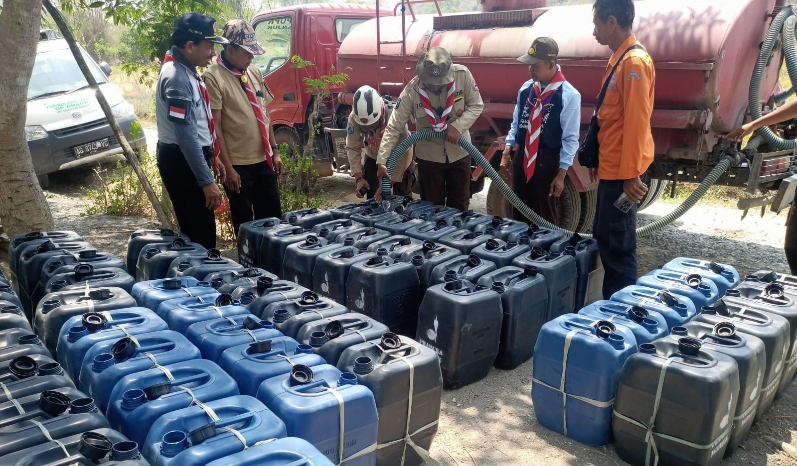 Kegiatan pendistribusian air bersih diawali oleh Ketua Kwarcab Nganjuk, dilanjutkan bantuan jurigen ukuran 35 liter total 70 jurigen diserahkan oleh Waka Abdimas Kwarcab Nganjuk kepada RT setempat.