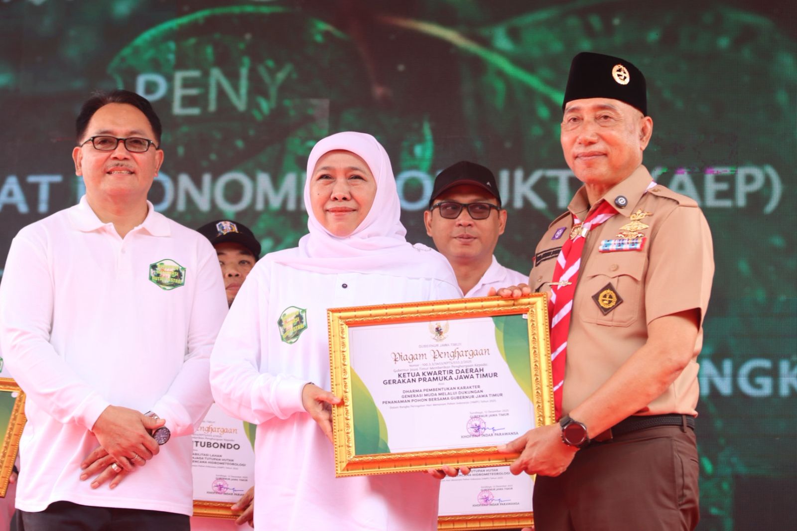 Lumajang — Ketua Kwartir Daerah Gerakan Pramuka Jawa Timur, Kak H. M. Arum Sabil, S.P., S.H., M.KL, menerima Penghargaan Dharma Pembentukan Karakter Generasi Muda dari Gubernur Jawa Timur, Kak Khofifah Indar Parawansa, atas dedikasinya dalam membangun karakter generasi muda melalui gerakan penanaman pohon dan edukasi cinta lingkungan.