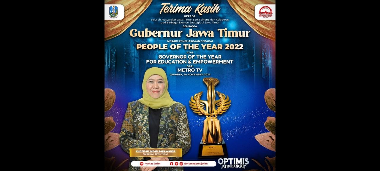 Predikat tersebut diberikan pada malam penganugerahan Metro TV People of The Year dalam rangka memperingati HUT Ke-22 Metro TV, Kamis (24/11).Apresiasi tersebut diterima Gubernur Khofifah, lantaran Jawa Timur memborong berbagai prestasi, khususnya dibidang pendidikan dan pemberdayaan.
