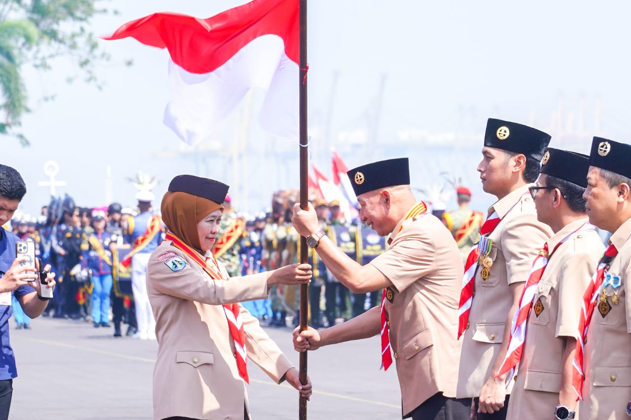 Surabaya- Kwartir Daerah (Kwarda) Gerakan Pramuka Jawa Timur menggelar Apel Peringatan Hari Pramuka Ke-64 Tahun 2025 di Dermaga Ujung Koarmada II, Surabaya, Kamis (14/8/2025). Apel Besar ini dihadiri secara langsung oleh Kakak Dr. (HC) Dra. Hj. Khofifah Indar Parawansa, M.Si. selaku Kamabida Gerakan Pramuka Jatim serta diikuti 1.694 peserta yang terdiri dari 1.219 anggota Pramuka se-Jawa Timur & 475 undangan VIP.
