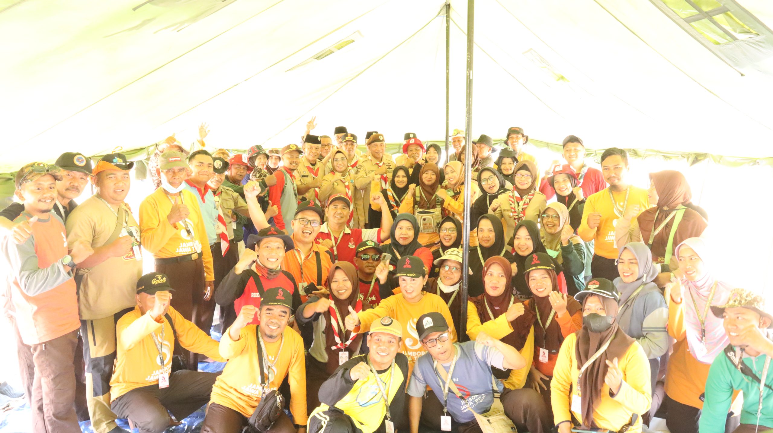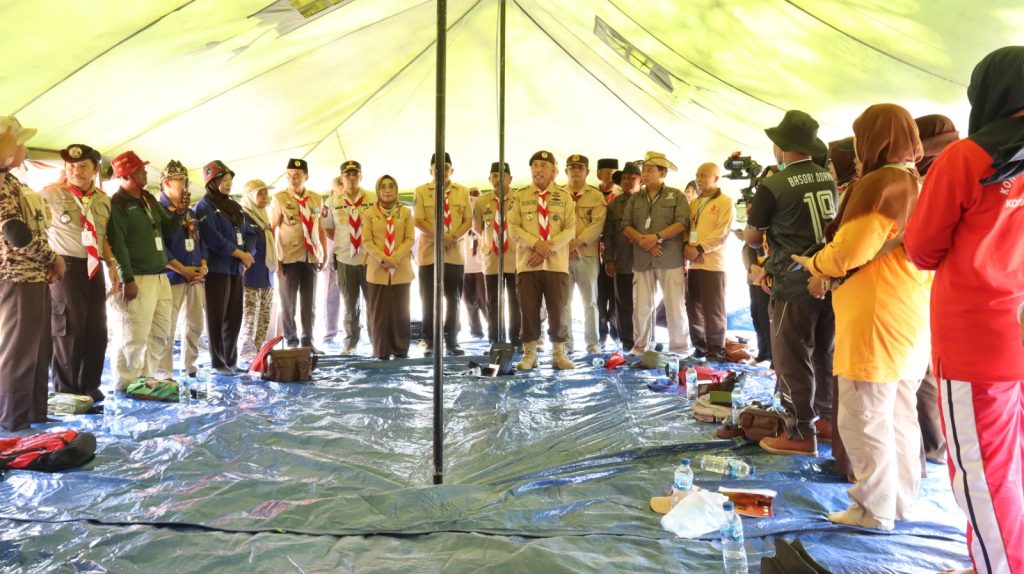 Kak Arum Sabil didampingi jajaran pengurus Pramuka Jatim berkunjung ke lokasi pada hari kedua, Selasa (3/10/2023). Ia bertemu seluruh pimpinan kontingen masing-masing kwarcab.