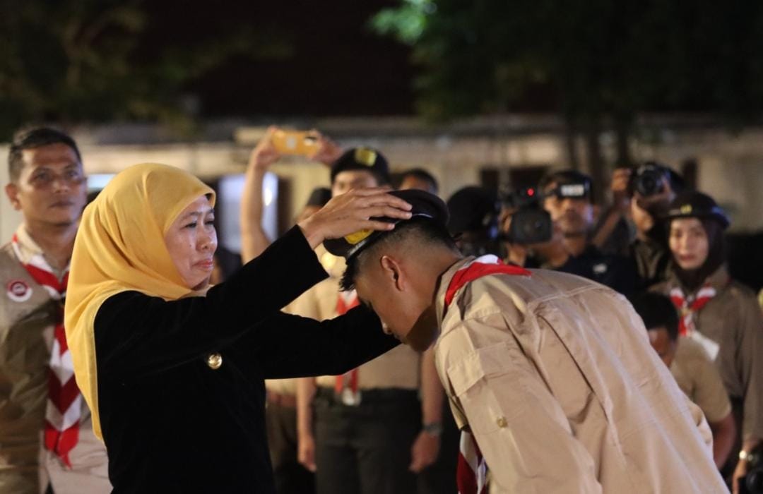 Sambutan dan apresiasi Kak Khofifah Indar Parawansa Gubernur Jawa Timur saat penyematan hasduk dan baret kepada Mario Aji sebagai Duta Pramuka Jawa Timur