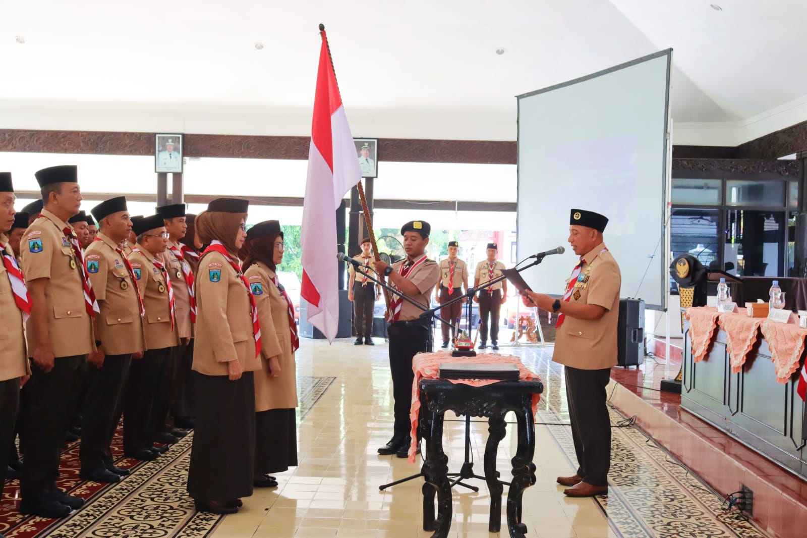 Lumajang – Ketua Kwartir Daerah Gerakan Pramuka Jawa Timur resmi melantik Pengurus Mabicab, Pengurus Kwarcab, dan Lembaga Pemeriksa Keuangan Gerakan Pramuka Lumajang masa bakti 2024-2029 pada Senin (27/5/2024) di Pendopo Arya Wiraraja Kabupaten Lumajang.