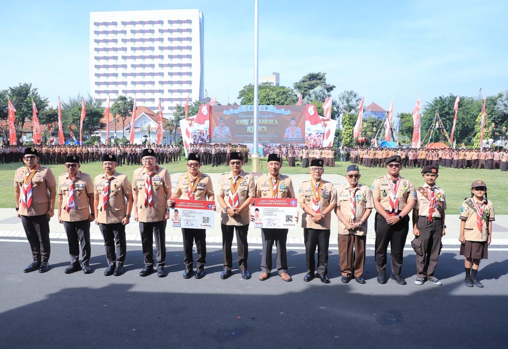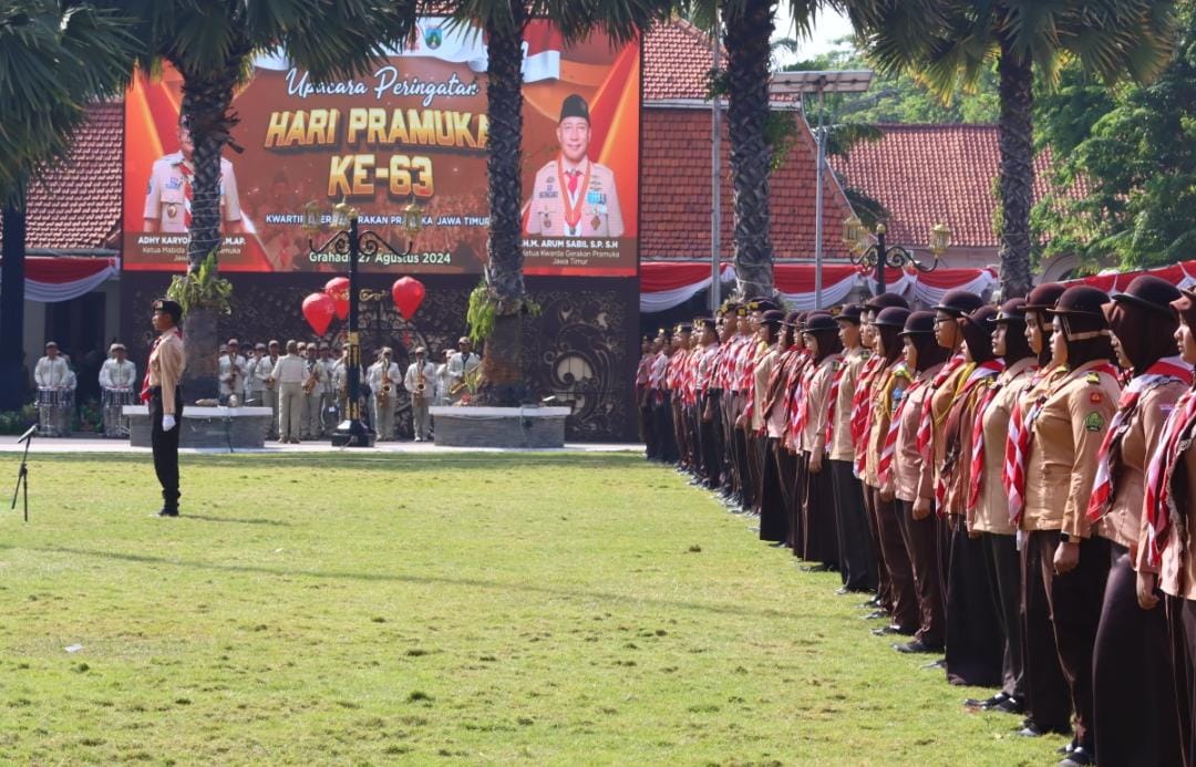 Kota Surabaya – Sebagai puncak peringatan Hari Pramuka, Kwartir Daerah Gerakan Pramuka Jawa Timur menyelenggarakan Upacara Hari Pramuka Ke-63 yang diikuti 1.500 orang pada Selasa 27 Agustus 2024 di Halaman Gedung Negara Grahadi Surabaya.
