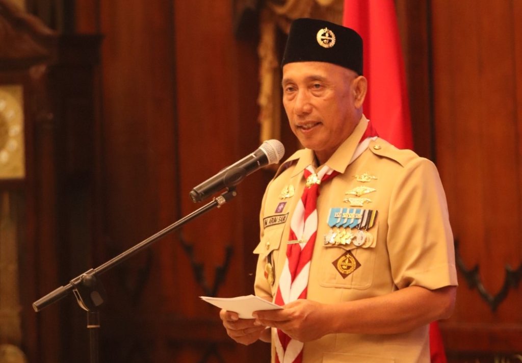 Kak Arum Sabil Ketua Kwarda Jatim bertindak sebagai pembina upacara, memandu seluruh peserta untuk mengucapkan Tri Satya secara bersama-sama.