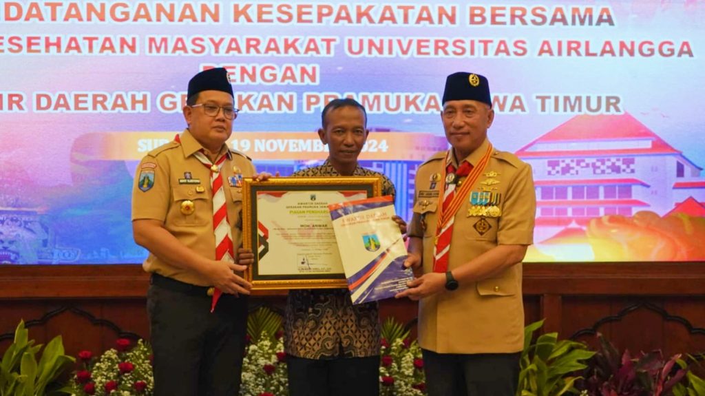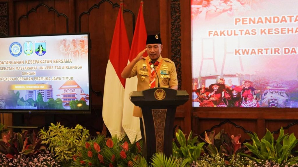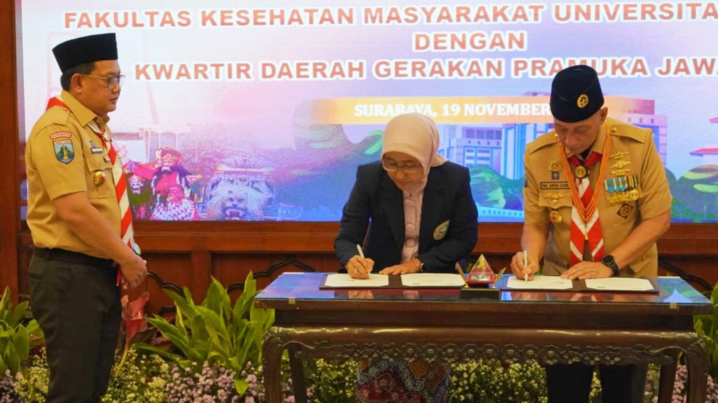 Surabaya – Dalam rangka menyongsong Indonesia Emas Tahun 2024, Kwartir Daerah Gerakan Pramuka Jawa Timur menjalin kerjasama bersama Fakultas Kesehatan Masyarakat Universitas Airlangga Surabaya pada Selasa, 19 November 2024 bertempat di Ruang Binaloka Adhikara Pemprov Jatim.
