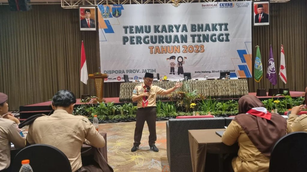 Malang – Dinas Dinas Kepemudaan dan Olahraga (DISPORA) Provinsi Jawa Timur Bekerjasama dengn Kwartir Daerah Gerakan Pramuka Jawa Timur menyelenggarakan kegiatan Temu Karya Bakti Pramuka Perguruan Tinggi pada 22 – 24 Juni 2023.